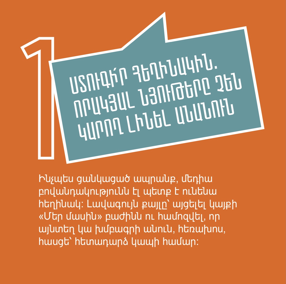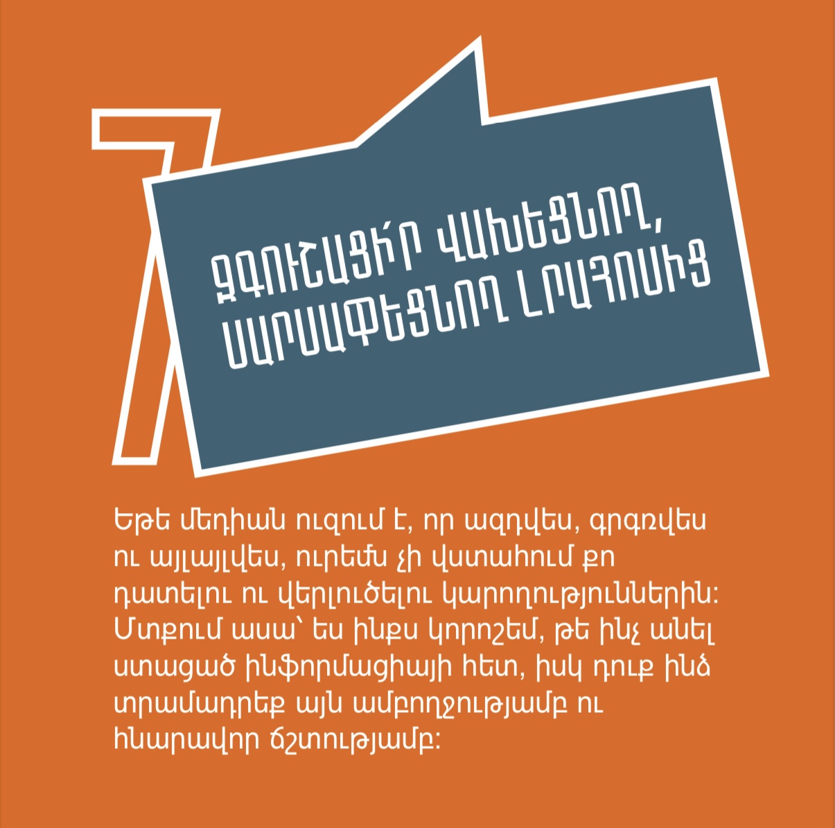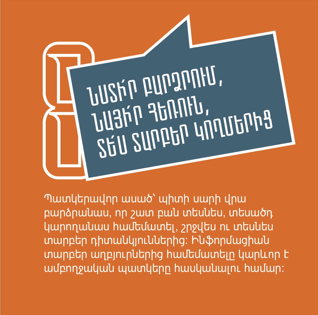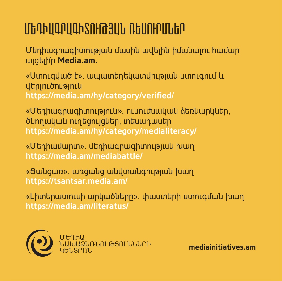 Դիմակայում ենք ապատեղեկատվությանը, լրավարակին, քարոզչությանն ու տեղեկատվական տարբեր մարտահրավերներին՝ պատվաստվելով մեդիագրագիտությամբ և կրելով այն որպես պաշտպանիչ դիմակ։