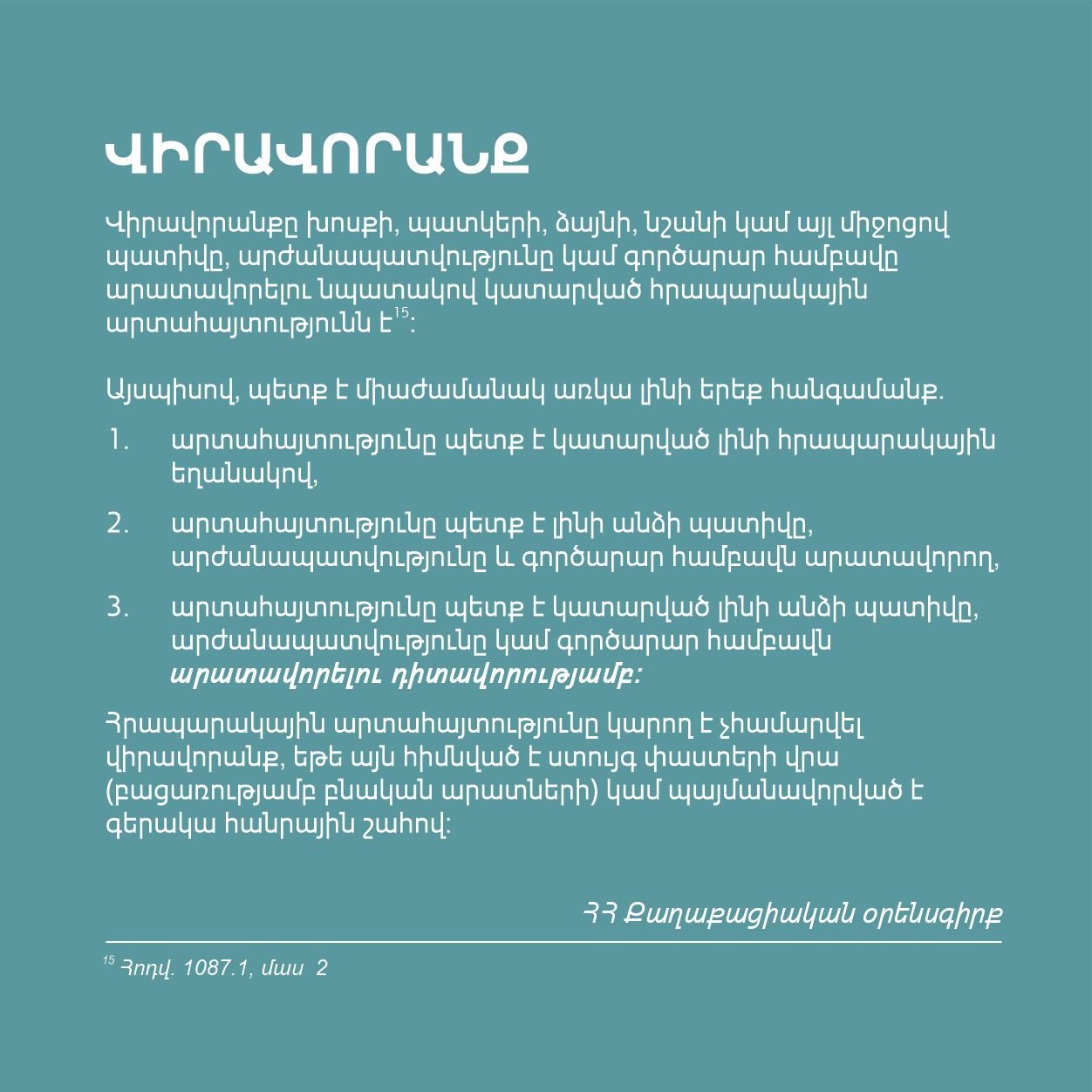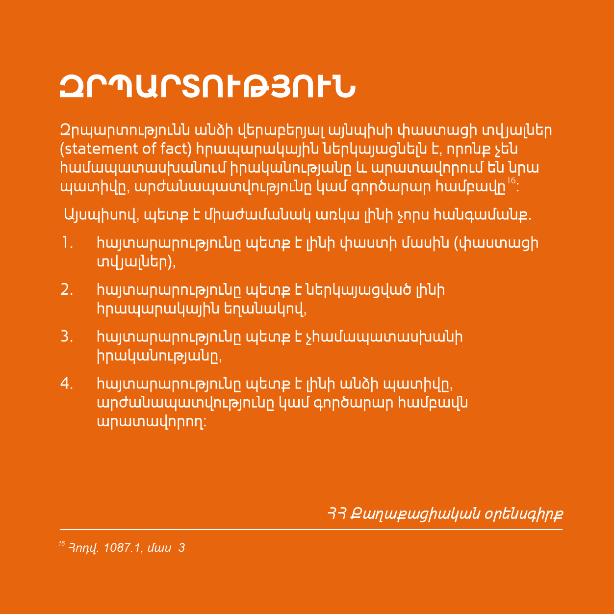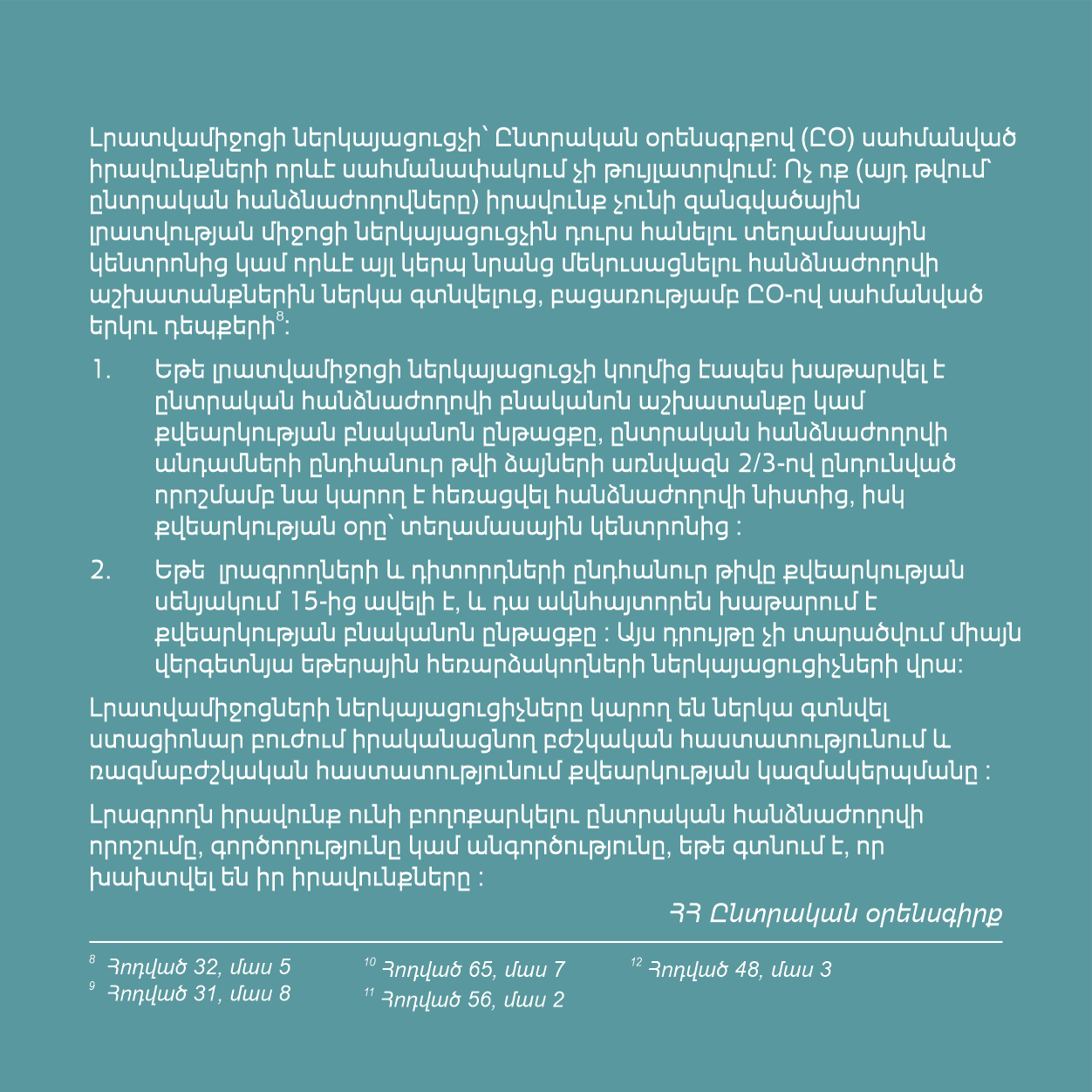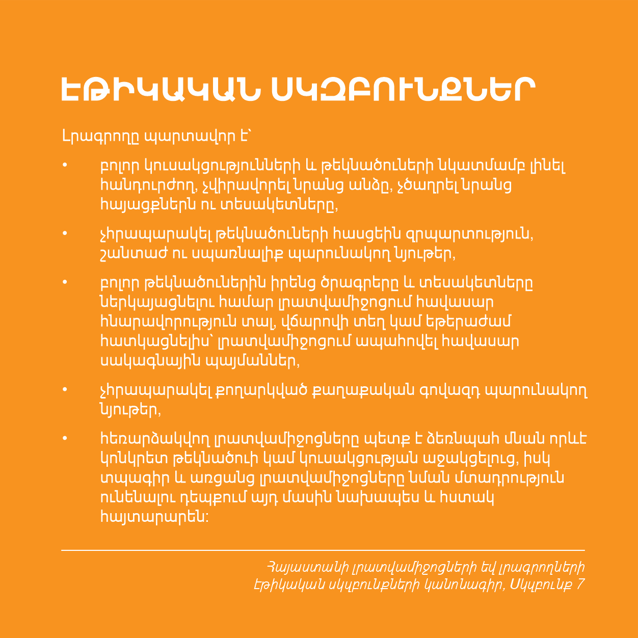Այն ձեռքի տակ ունենալով՝ մեդիայի ներկայացուցիչները ևս մեկ անգամ կարող են վերհիշել իրենց պարտականությունները, գործունեության երաշխիքները և էթիկական սկզբունքները, անհրաժեշտության դեպքում պաշտպանել սեփական իրավունքները և գործել ՀՀ օրենսդրության պահանջներին համապատասխան։