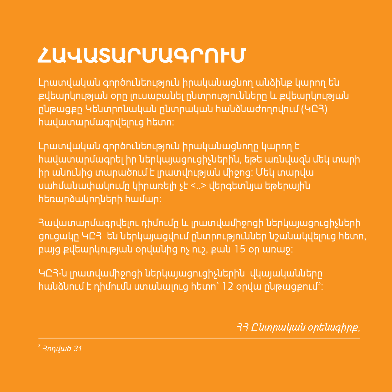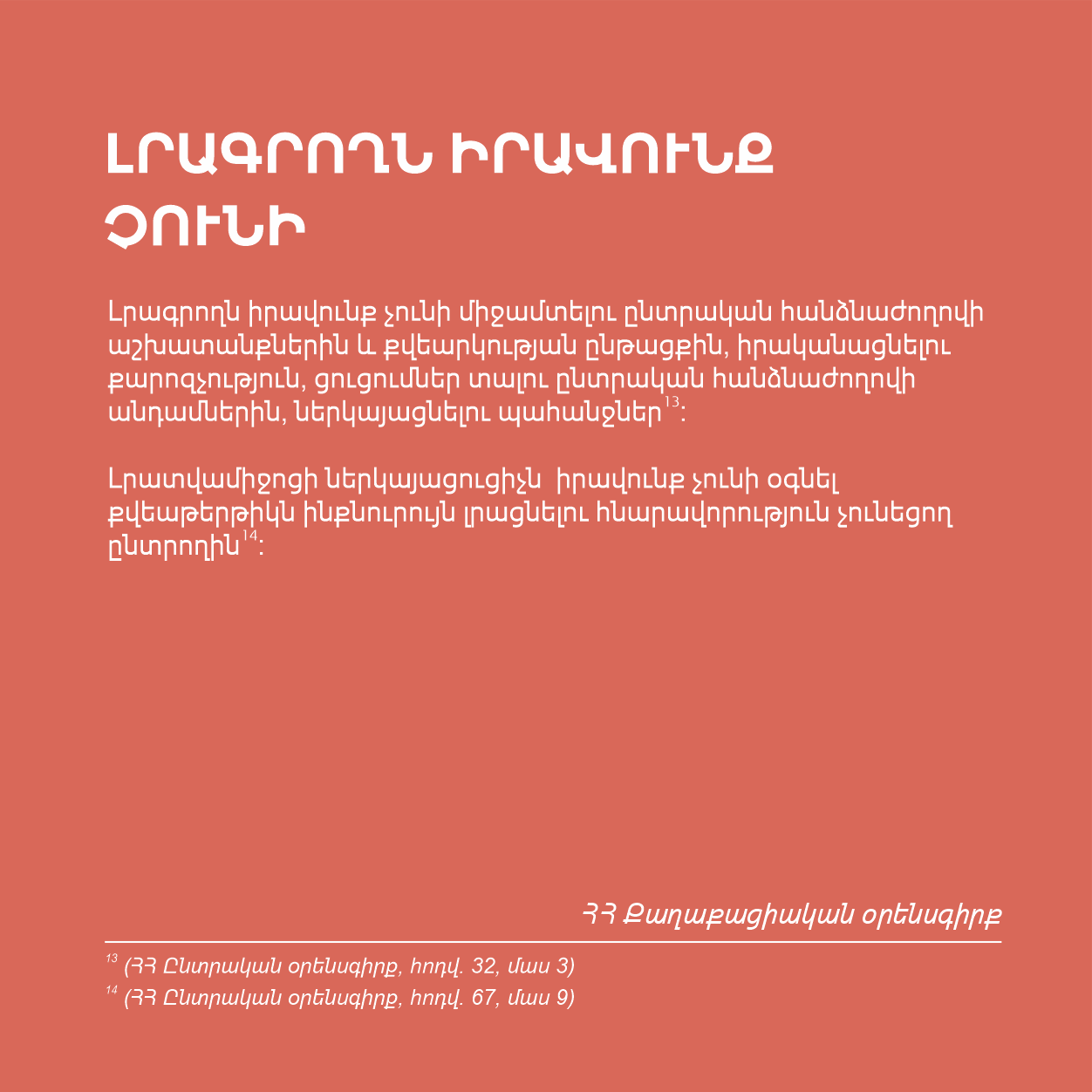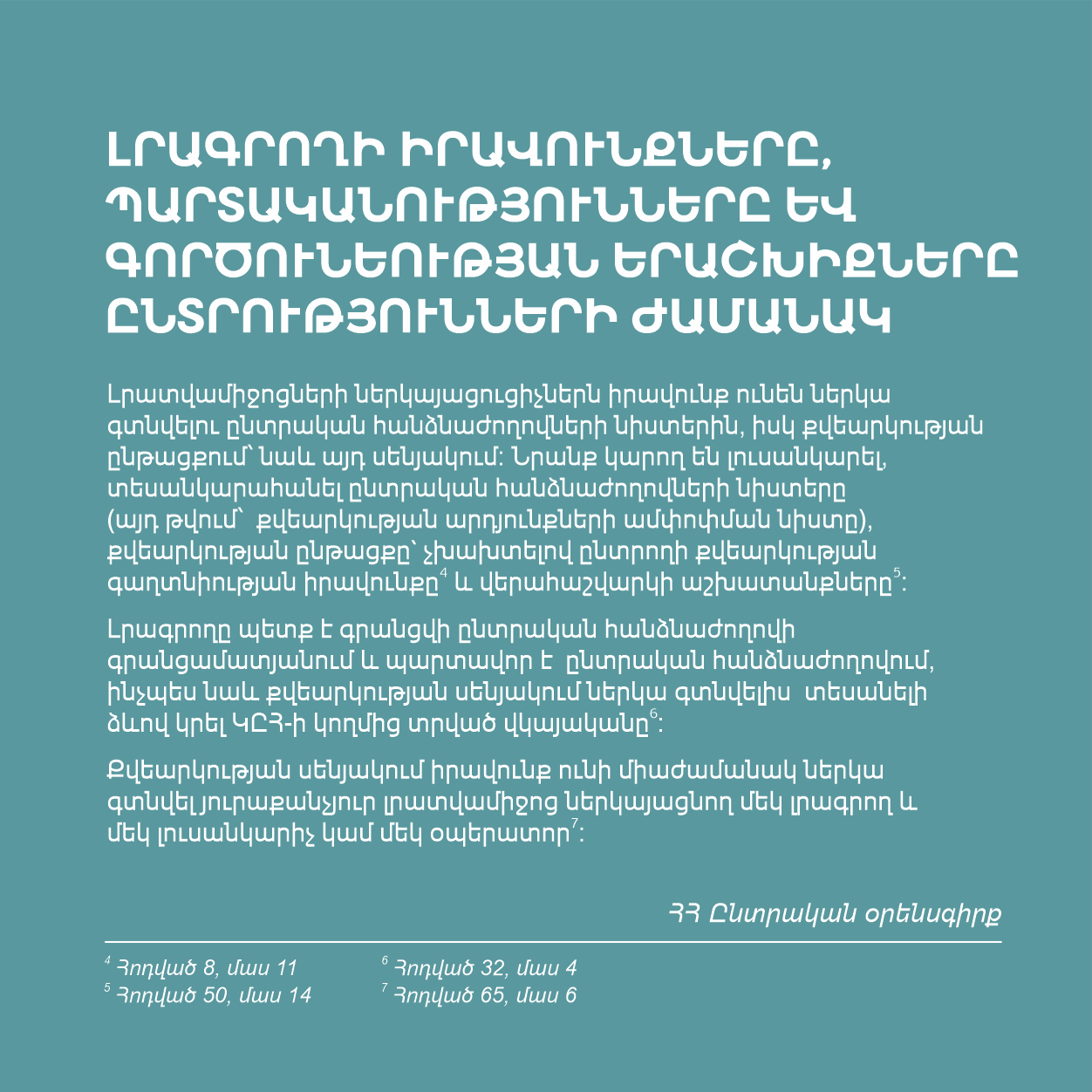 Հունիսի 20-ի արտահերթ խորհրդարանական ընտրություններին ընդառաջ հատուկ ընտրությունները լուսաբանող լրագրողների համար պատրաստել ենք տեղեկատվական հուշաթերթիկ։